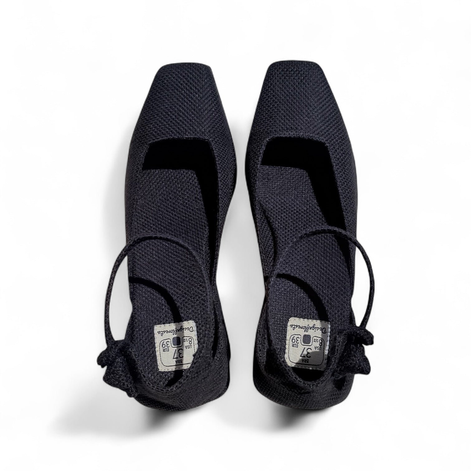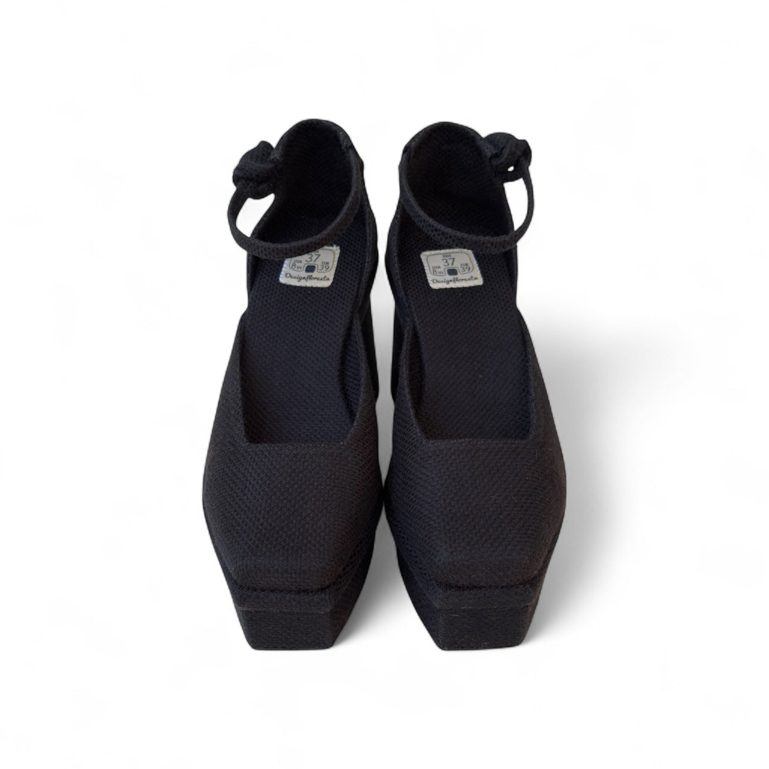 Sapato Kyoto, feito com linho de tapeçaria de altíssima qualidade. Salto Bloco em EVA , com 9cm de altura e meia pata com 3cm de altura, ótima estabilidade. Fecho com botão de linho ajustável em formato de nó, passando por uma alça de elástico para fechamento. Solado em látex vegetal, biodegradável e antiderrapante.