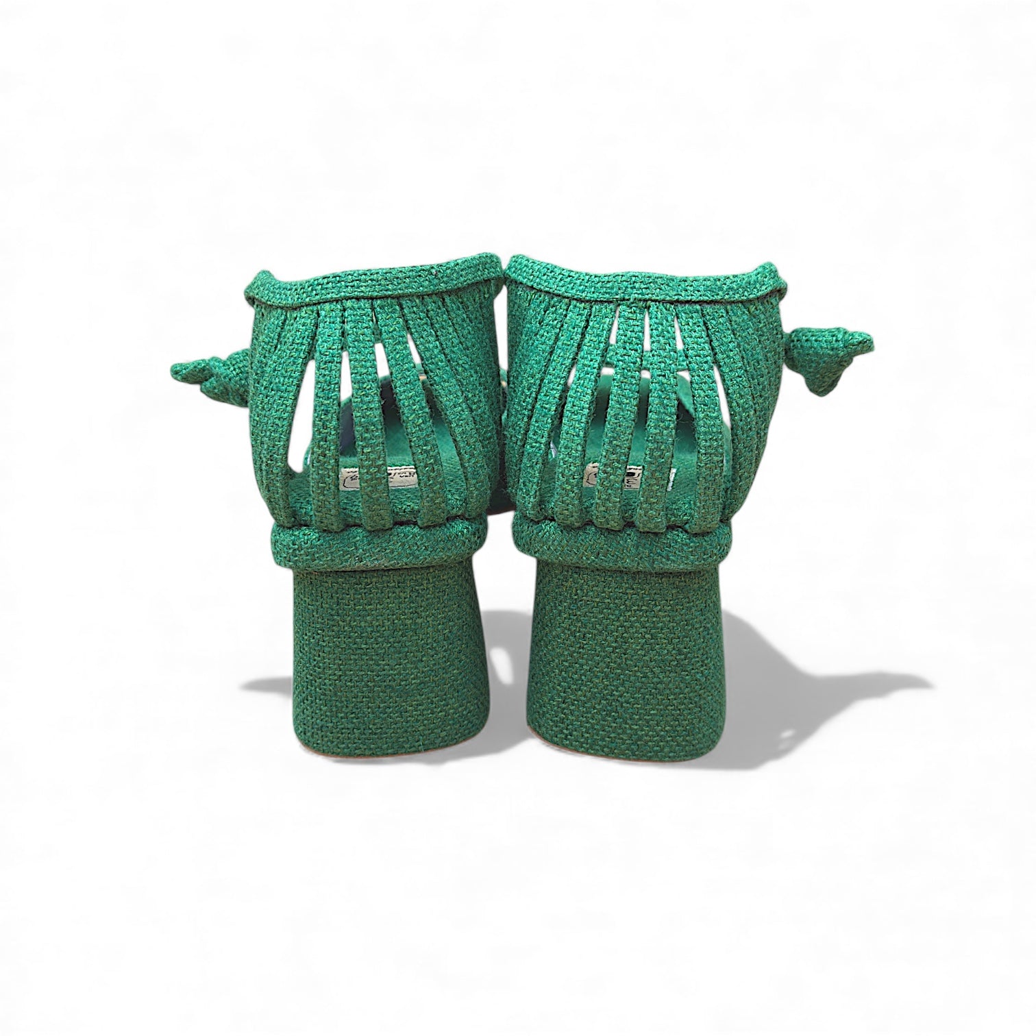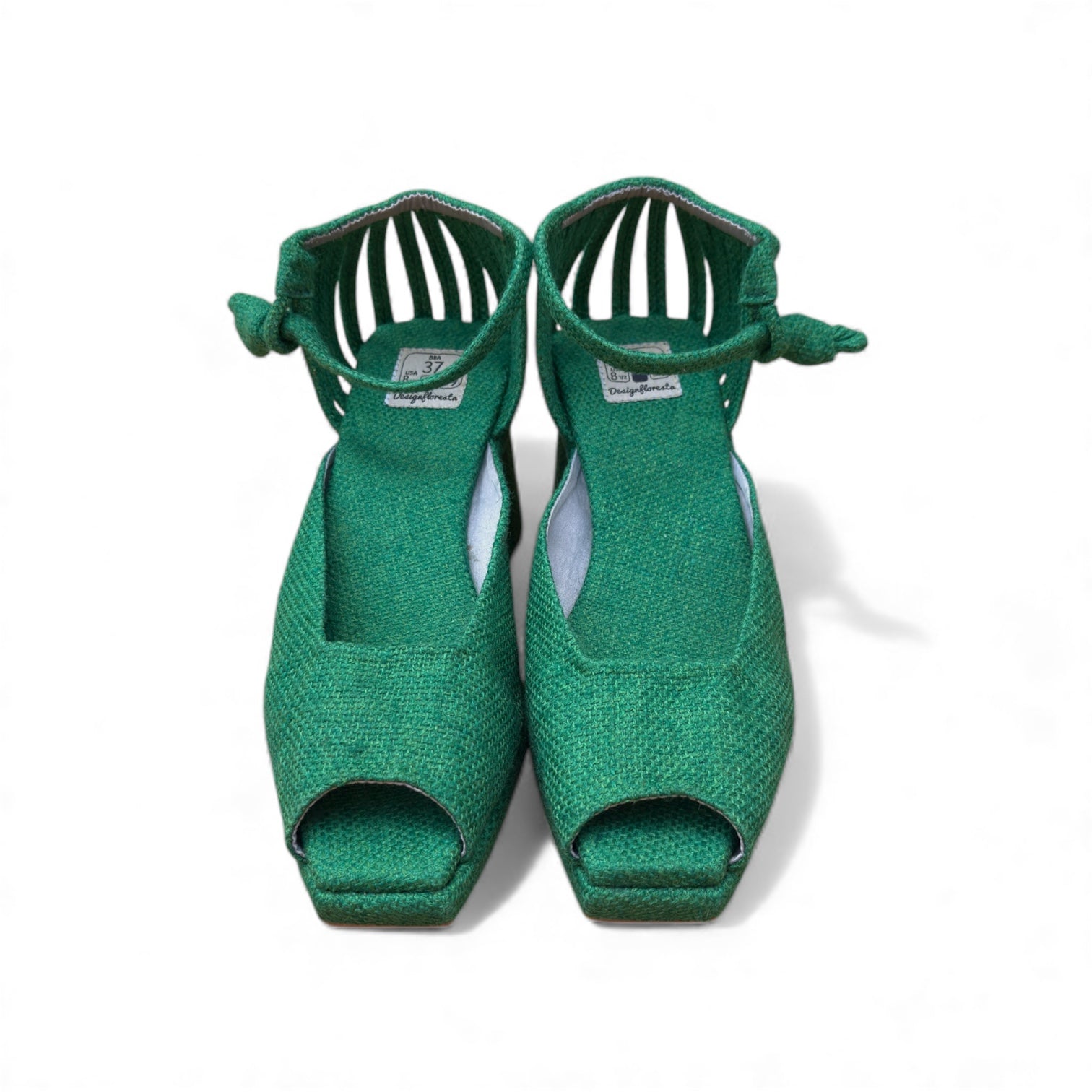 Sapato Kyoto, feito com linho de tapeçaria de altíssima qualidade, cabedal forrado. Salto Bloco em EVA , com 7cm de altura, ótimo conforto e estabilidade. Fecho com botão de linho ajustável em formato de nó, passando por uma alça de elástico para fechamento. Solado em látex vegetal, biodegradável e antiderrapante.
