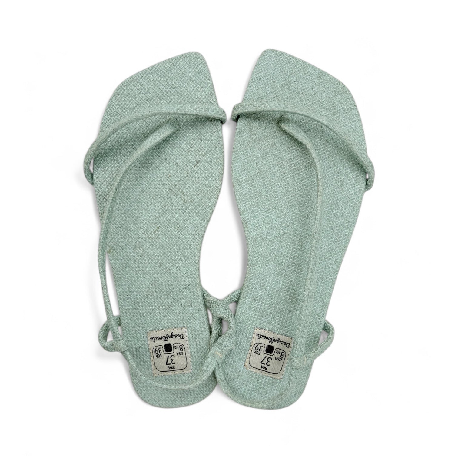 Sandália Capim, feita com linho rústico macio de altíssima qualidade. Ajuste com elástico na lateral. Solado em látex vegetal, biodegradável e antiderrapante.