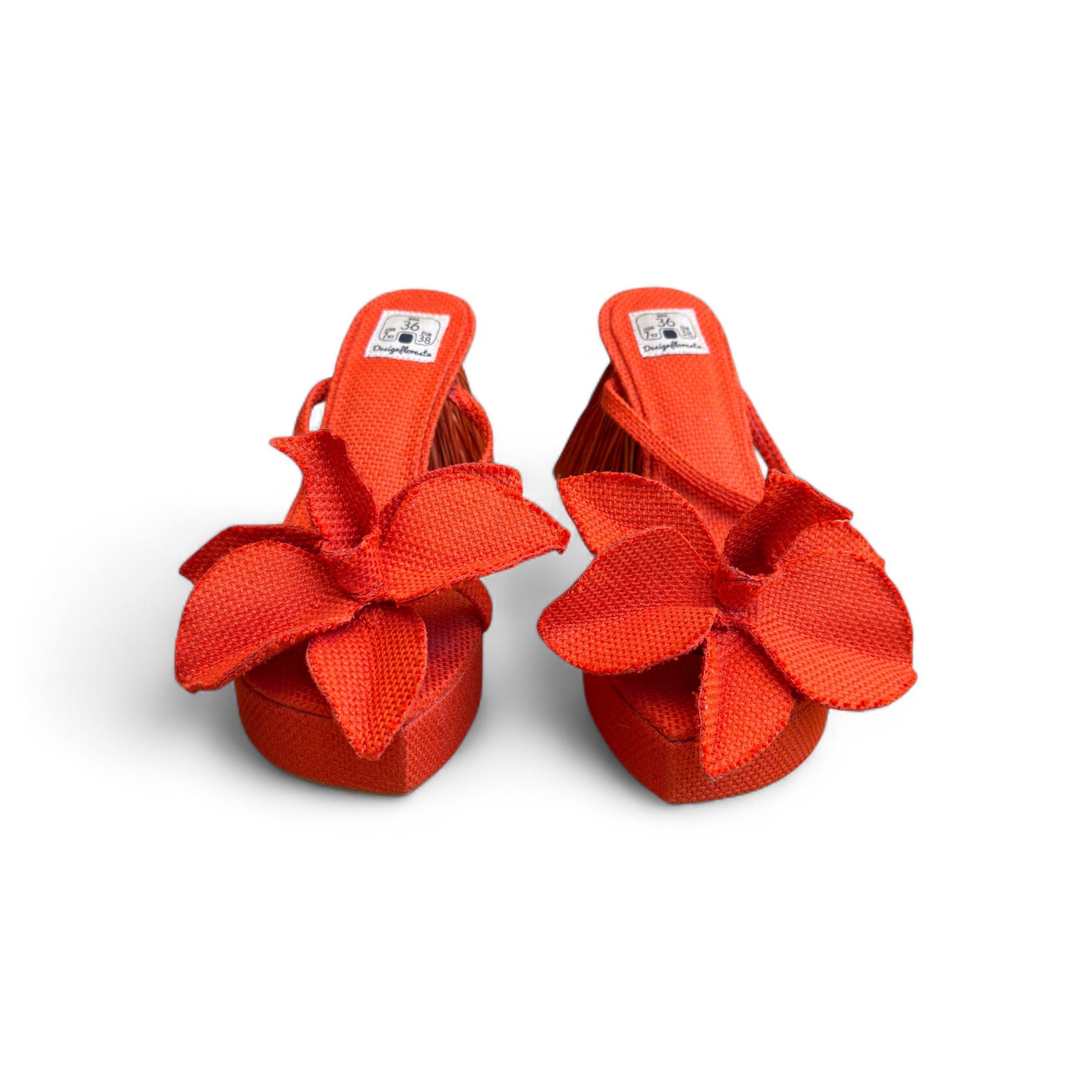 Sandália Orquídea Gigante, feita com linho rústico macio de altíssima qualidade. Alça para fixação no peito do pé (tipo Mule), salto de madeira revestido com fios de seda de Buriti. Solado em látex vegetal biodegradável e antederrapante.