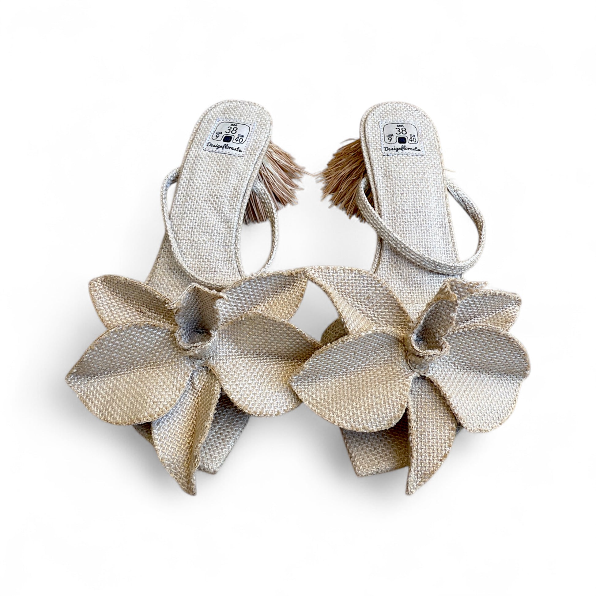 Sandália Orquídea Gigante, feita com linho rústico macio de altíssima qualidade. Alça para fixação no peito do pé (tipo Mule), salto de madeira revestido com fios de seda de Buriti. Solado em látex vegetal biodegradável e antederrapante.