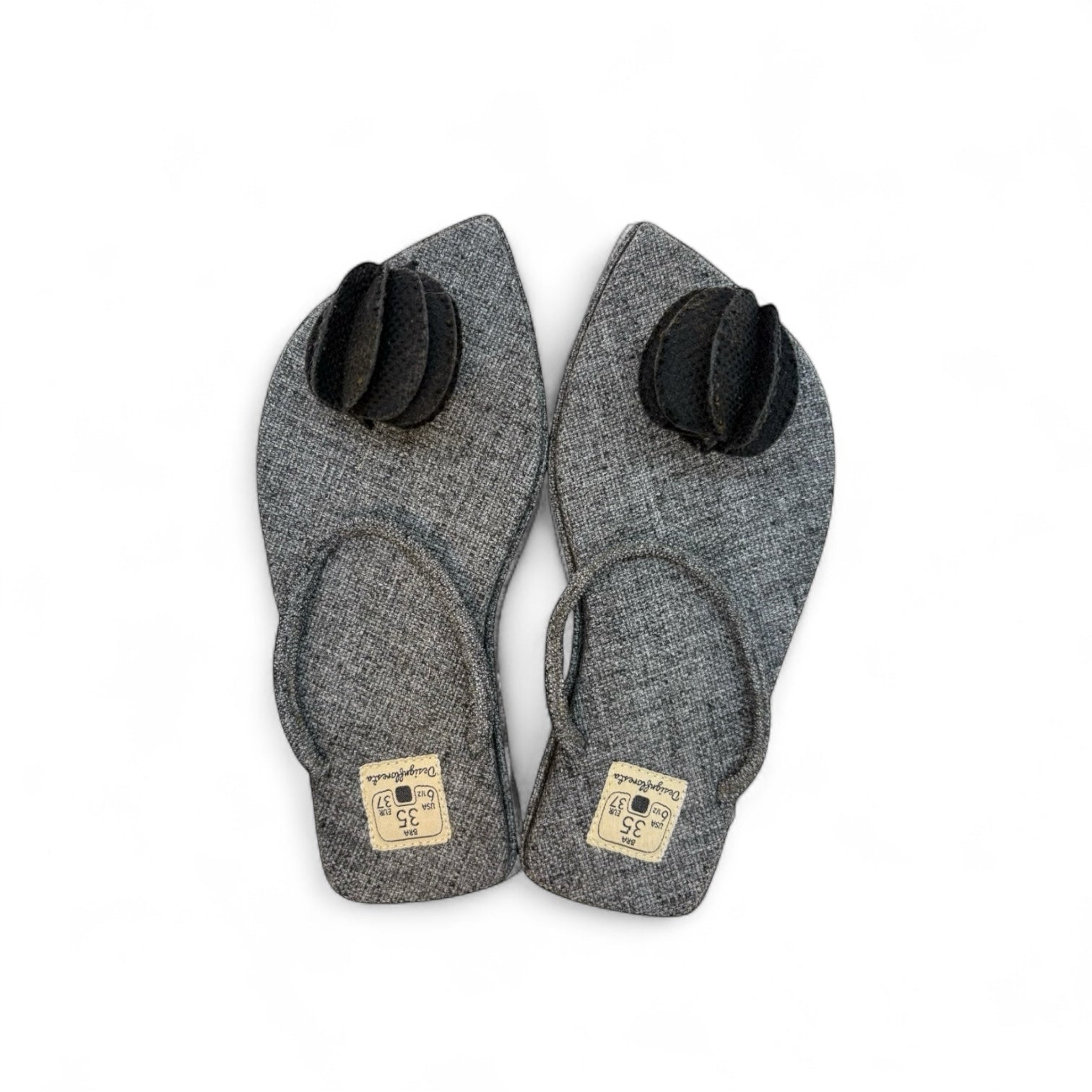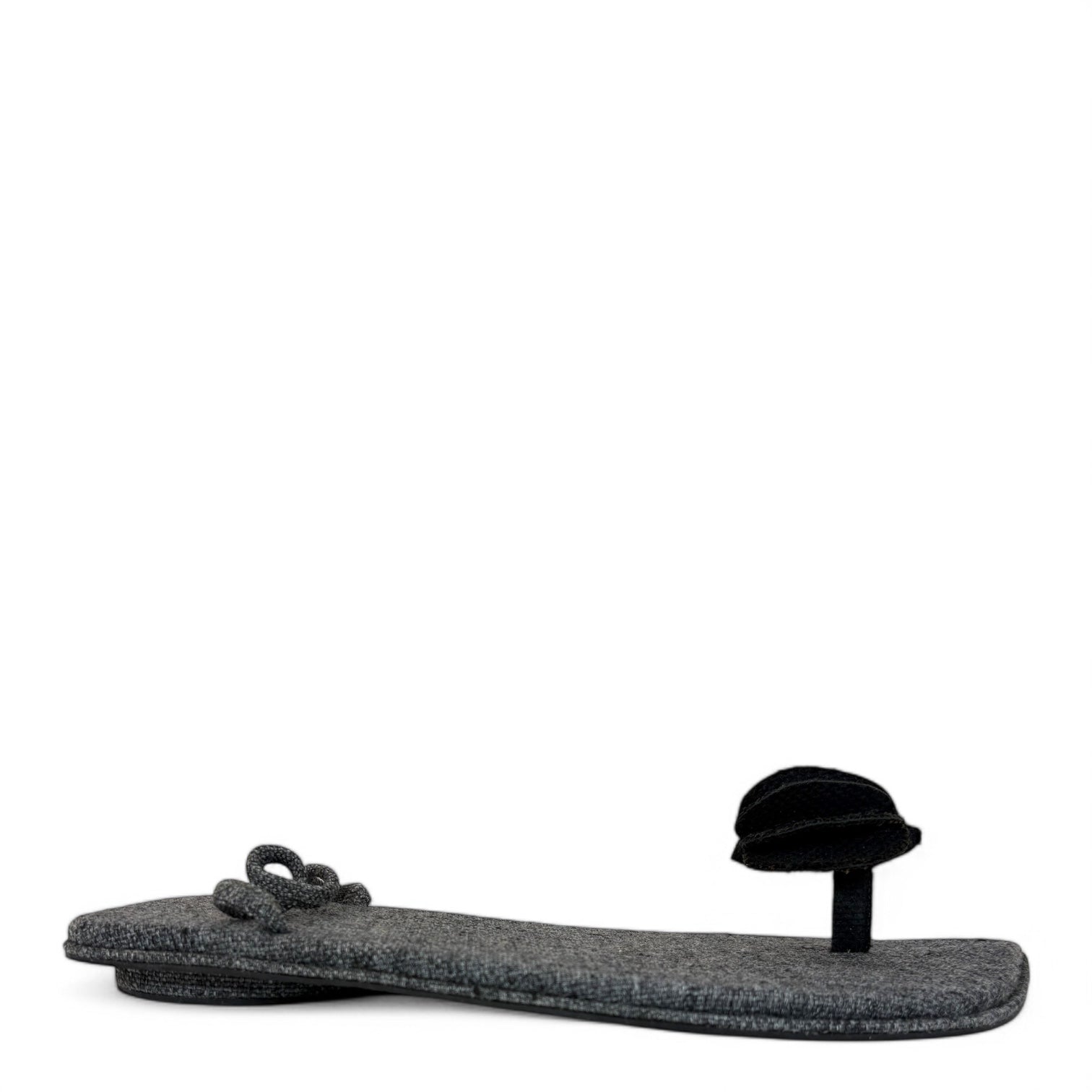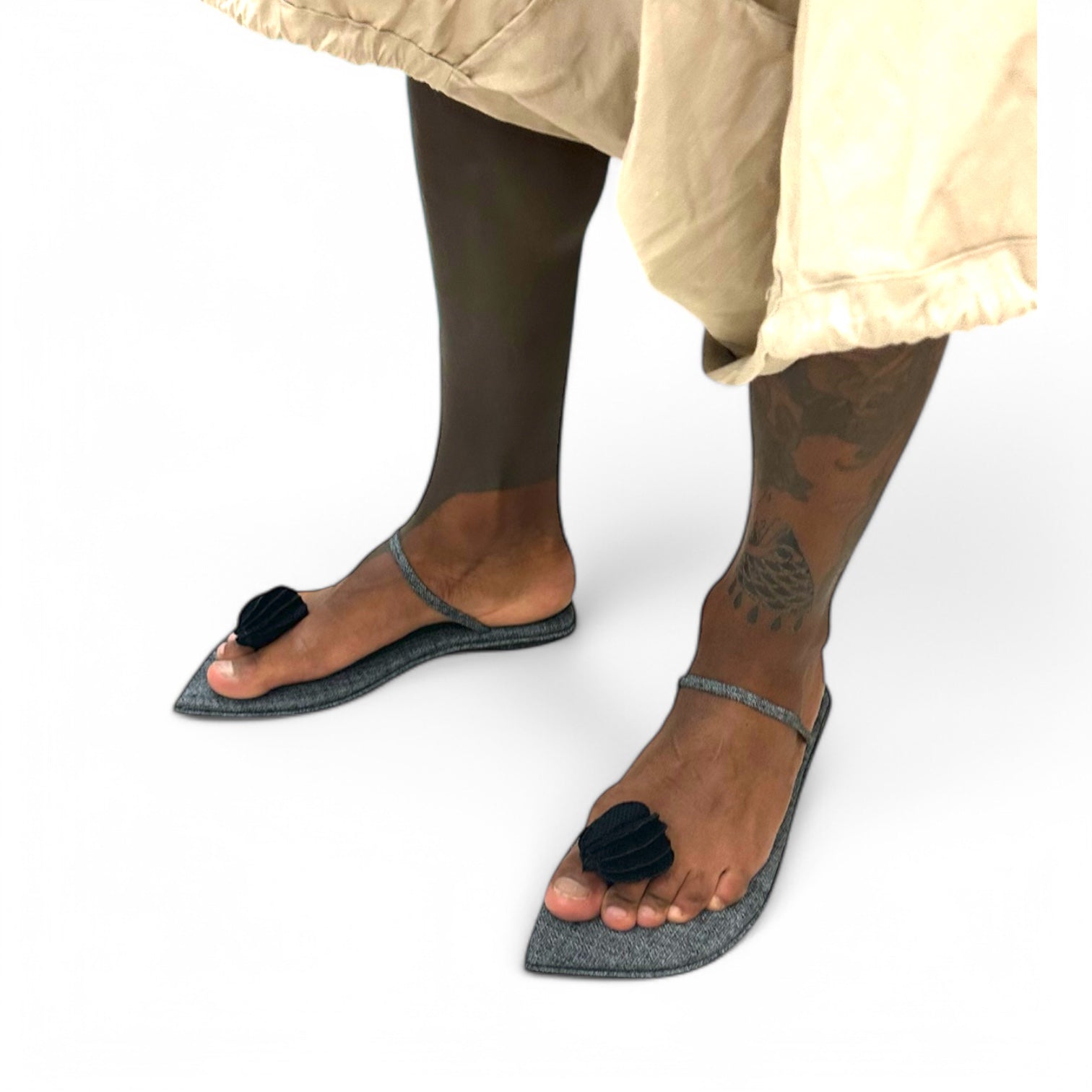 Sandália de dedo, tipo mule, cabedal feito com linho rústico de altíssima qualidade. Solado em látex vegetal biodegradável e antiderrapante.