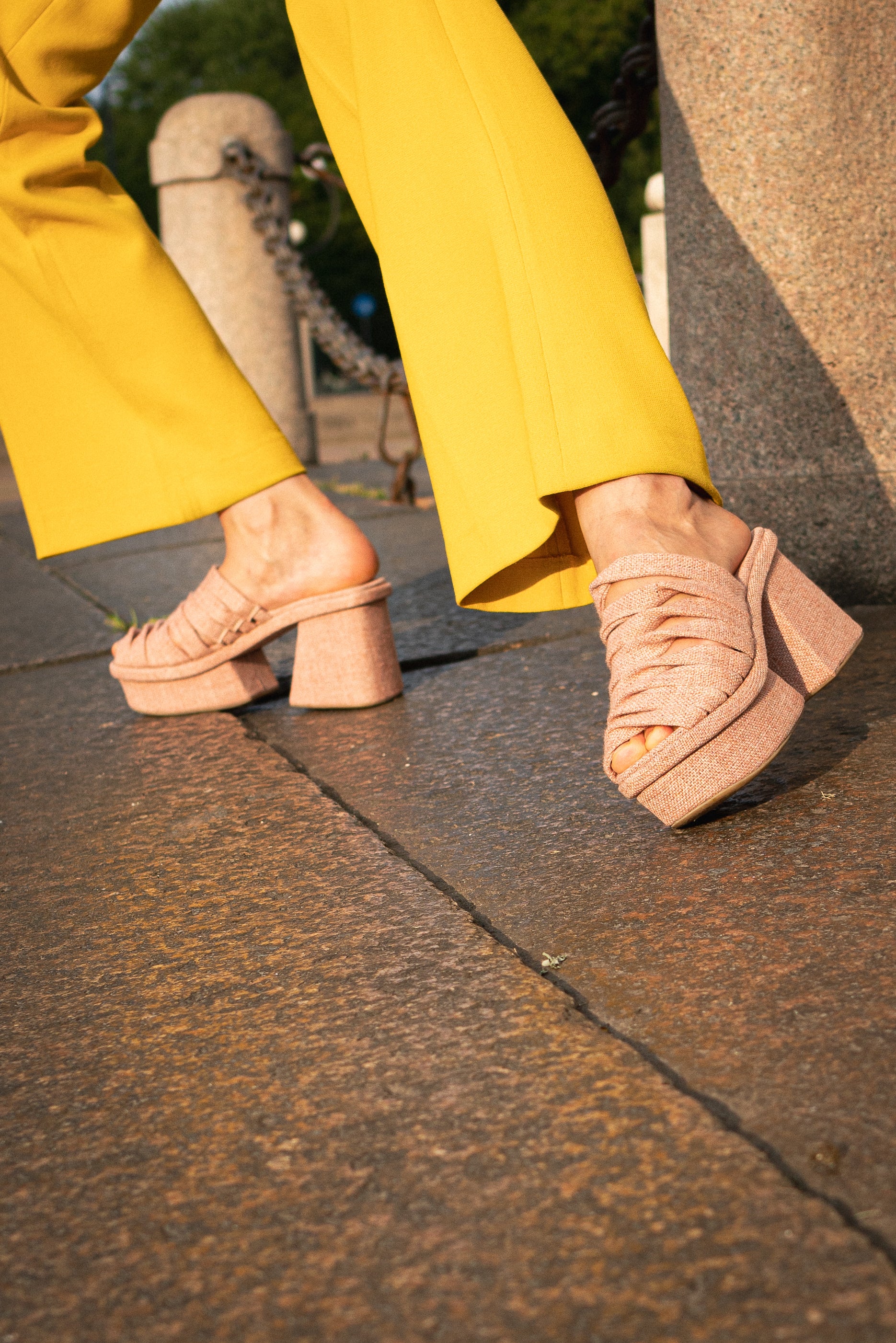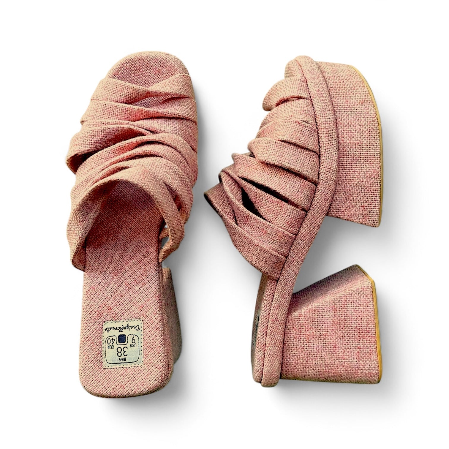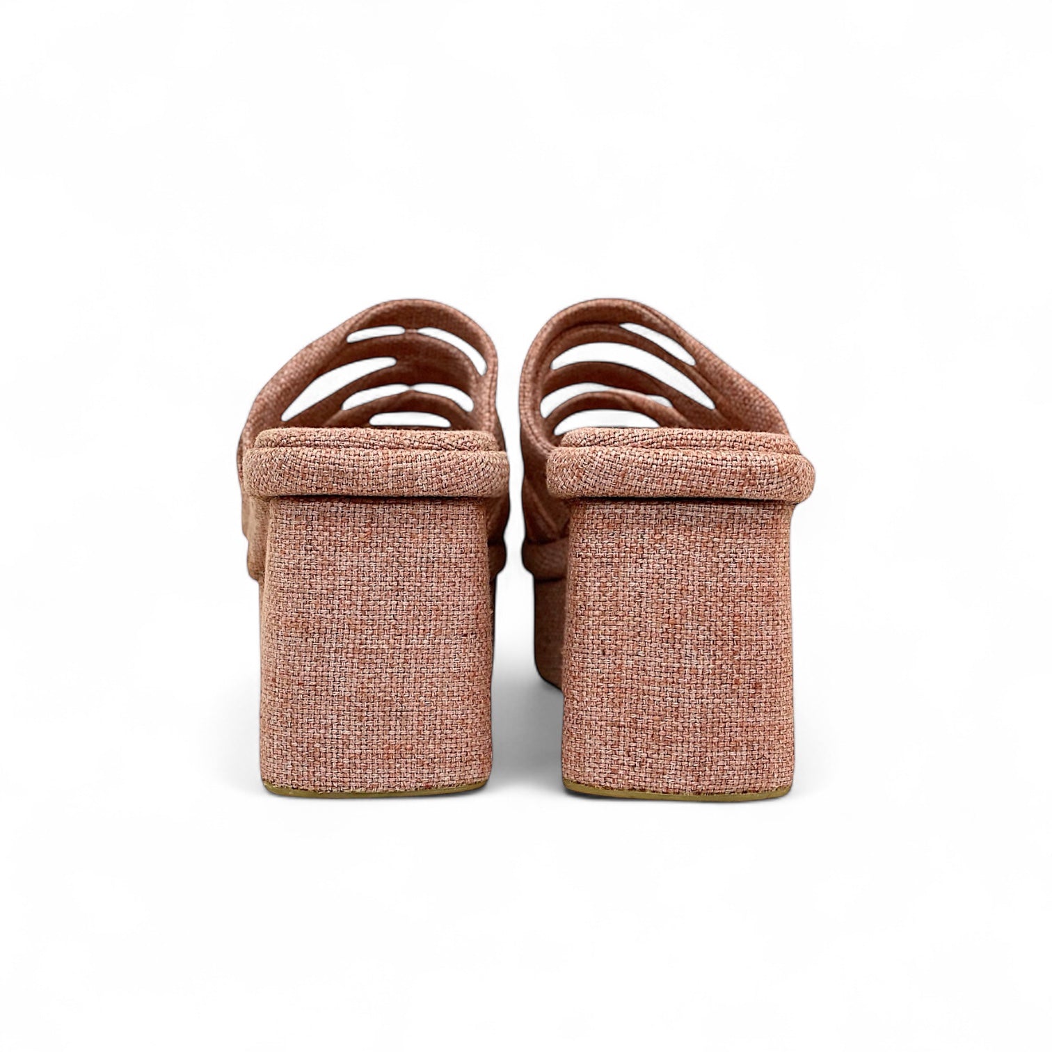 Tamanco Tamarindo, feito com linho rústico macio de altíssima qualidade. Salto Bloco em EVA, com 9cm de altura e meia pata com 3cm de altura. Encaixe firme do peito do pé nas tiras do cabedal. Solado em látex vegetal, biodegradáveis e antiderrapante.