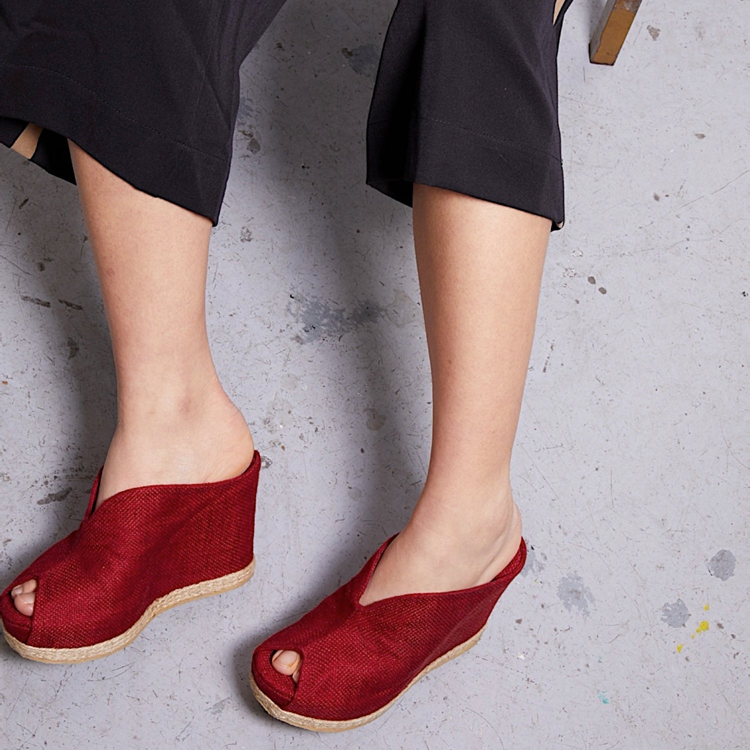 Cabedal feito em linhão macio de tapeçaria de altíssima qualidade, salto 10 cm estável e confortável. Detalhe de corda de juta na base do salto, solado em látex vegetal biodegradável.